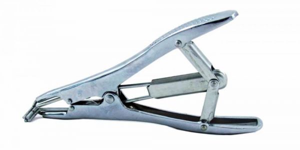 Alicate elastrador para castração de Ovinos, Caprinos. Confeccionado em material de alta qualidade, super reforçado, possui banho galvanizado, o que dá proteção extra contra ferrugem.Possui rebites de alta resistência, com todas as cabeças arredondadas para proteção tanto de quem aplica os anéis, como para os animais.Cabo anatômico que facilita o manejo e não deixa que o alicate escorregue da mão.Grande abertura de aplicação dos anéis: 6 x 4cm. Seu formato permite esticar os anéis de borracha para poder passar os testículos e soltar o anel sobre o cordão espermático.Comprimento: 22cm